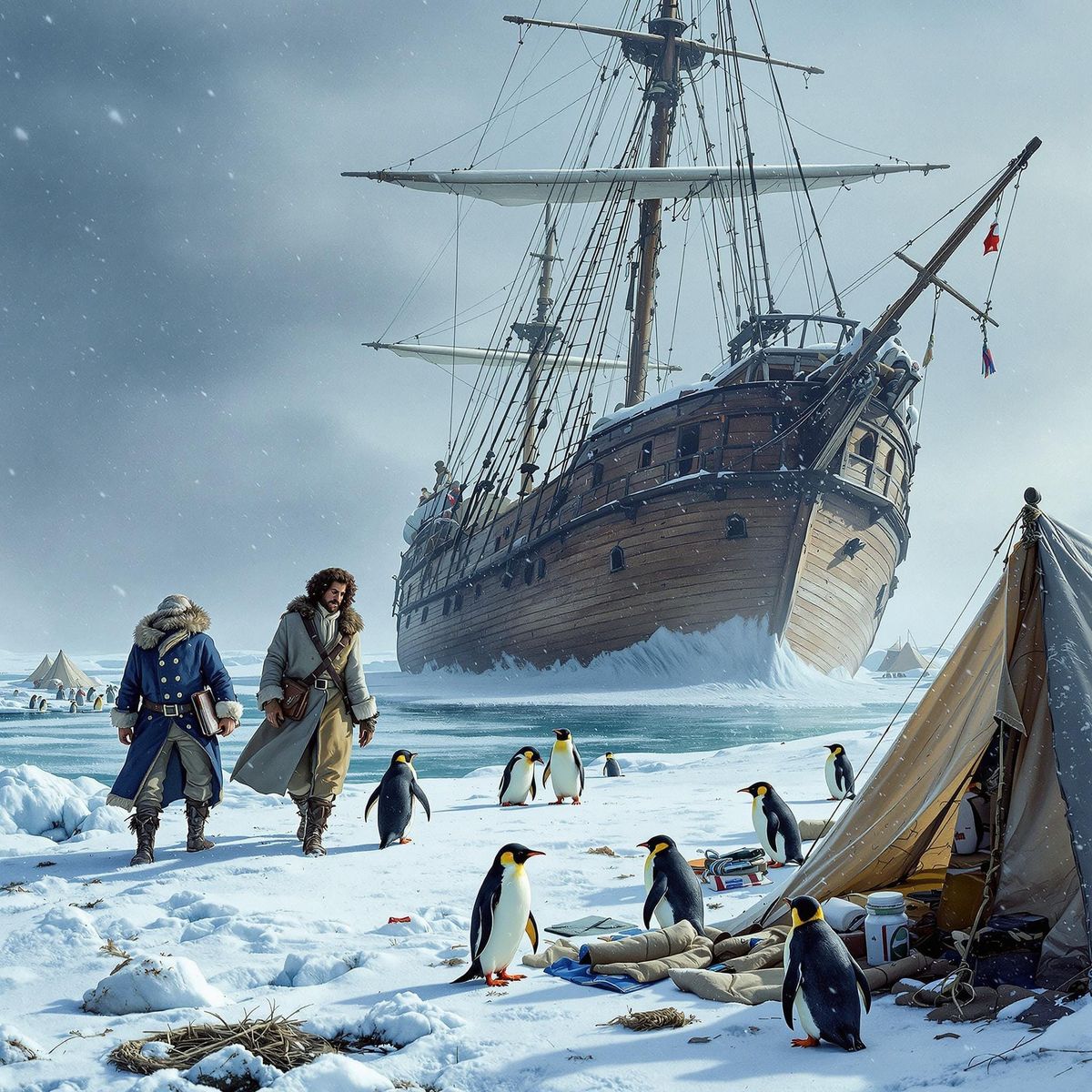 We got a frozen frontier, a mighty wooden warhorse of a ship stuck in the drink, and a squad of penguins clearly conducting a top-secret snow conference. One explorer’s holdin’ books, the other’s holdin’ destiny, and those tuxedoed operatives are guardin’ the flap like it’s Game 7 of the Igloo Finals.