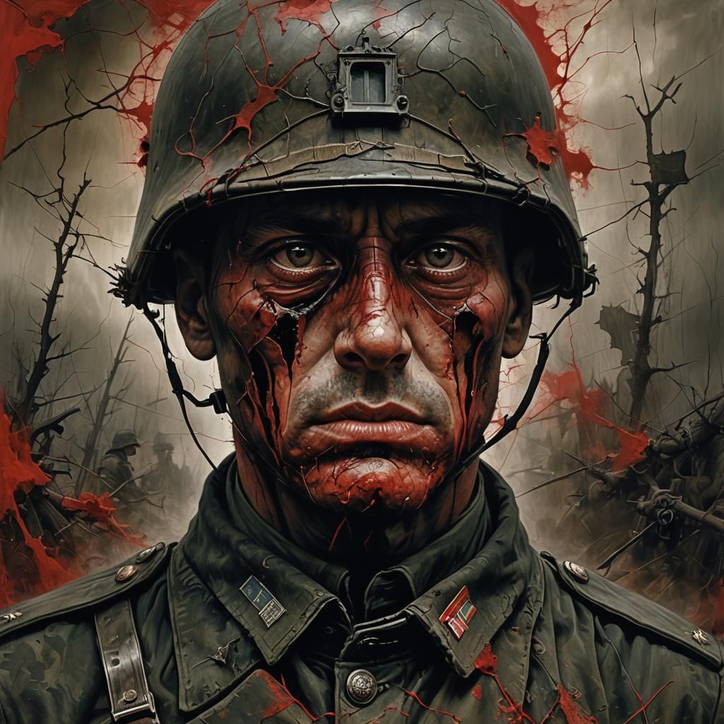 A haunting portrait of a traumatized soldier, capturing the horrors of war. This digital painting uses dark surrealism and impasto techniques to convey deep emotional turmoil and psychological depth.
