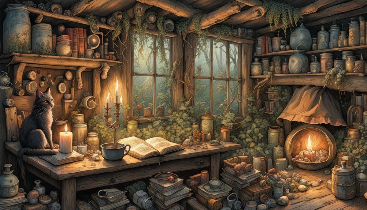 A detailed matte painting of a witch's hut with a black cat inside. Medicinal herbs, candles and books create a fantastical scene with deep colors reminiscent of concept art.