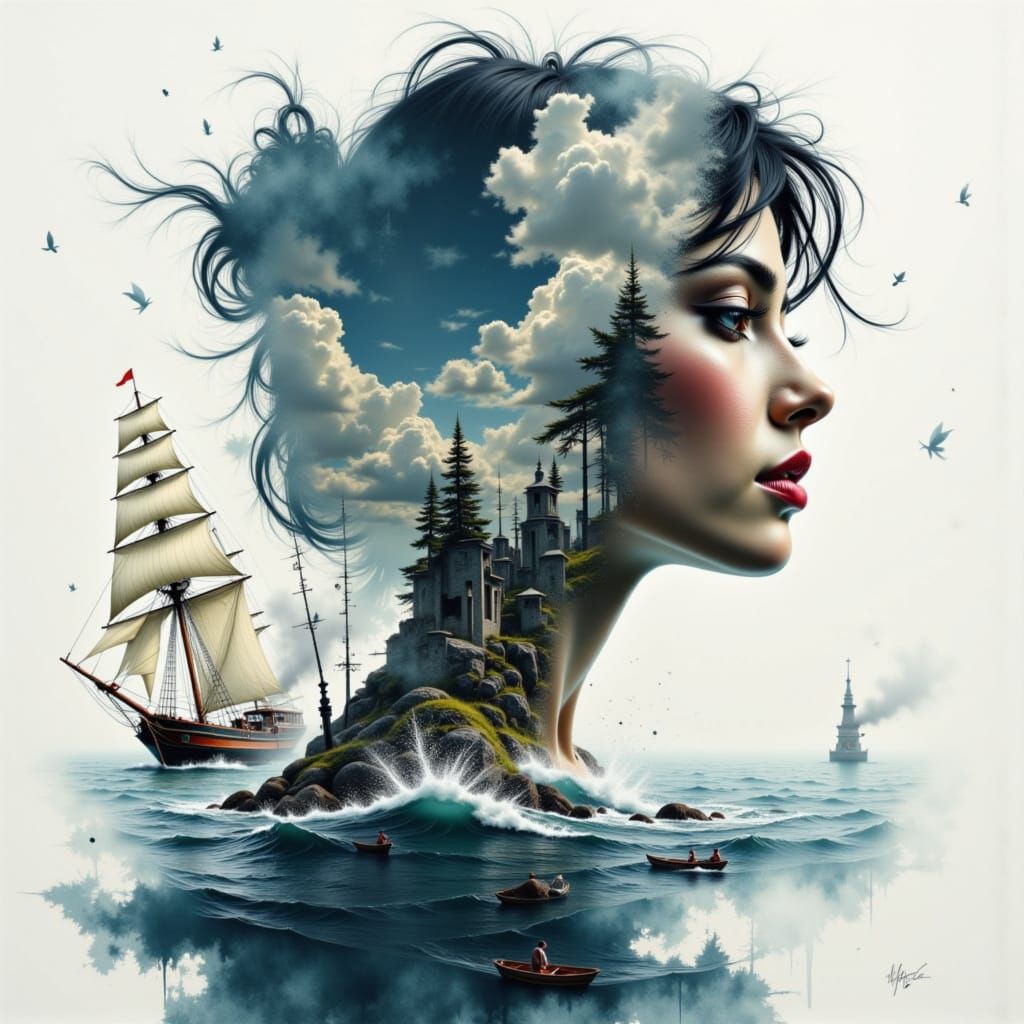 <lora:ComplexionV2:1.0> <lora:DreamLike V2:1.0> Spiriling Double Exposure Portrait Sailing Ship Digital watercolor Illustration with Dual Exposure of seascape boats inside the portarait, by JK Waterhouse, Carne Griffiths, Minjae Lee, Ana Paula Hoppe, Stylized watercolor art, Intricate, Complex contrast, ...