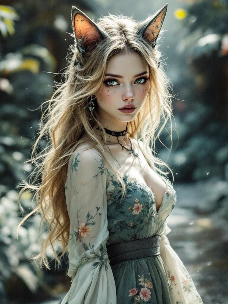 This image shows a graceful, cat-eared young woman with long blonde hair and green eyes standing in a courtyard of tropical plants. The watercolor and ink-splatter art has smoky gradients and fluid movement.