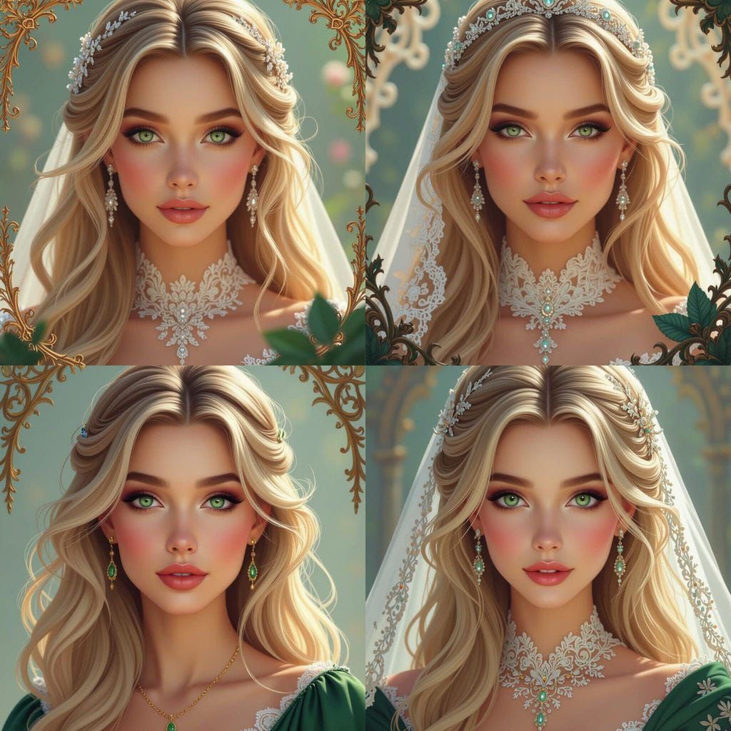 A stunning image of a bride with flowing blonde hair, rendered in a detailed matte painting style with deep, complementary colors. Perfect for fantasy concept art.