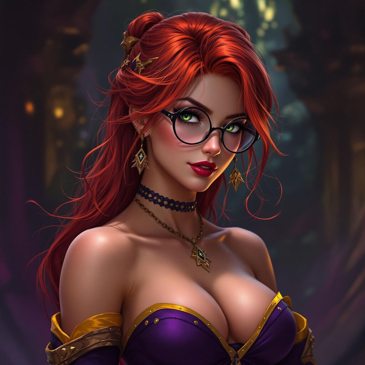 A striking picture of a muscular, red-haired woman with green eyes wearing glasses in a dark fantasy setting. The image is a hyperdetailed digital artwork with vibrant purple and yellow colors.