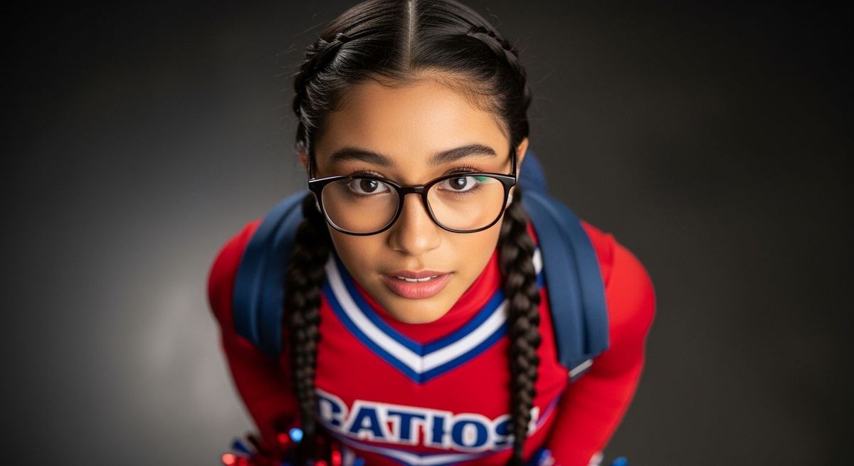 This image shows a young Latina cheerleader kneeling and smiling shyly. She is wearing a red and blue uniform, glasses, and braided pigtails, captured in a professional portrait style with blurred background and studio lighting.