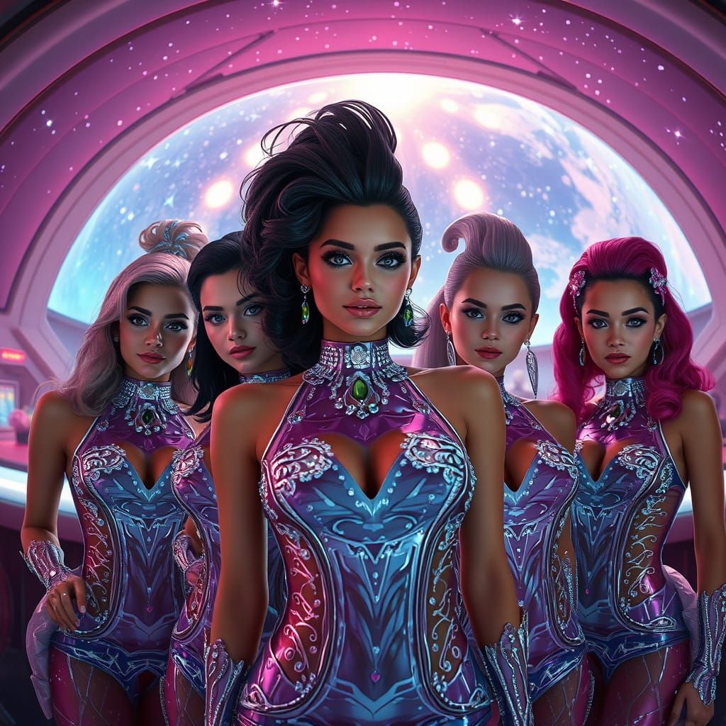This image showcases 5 women from diverse cultures in a stunning futuristic space lounge. Each wears a miniature lace-trimmed dress made of shimmering latex, inspired by a hyper-realistic style with sharp focus on their happy faces, sparkling diamond jewelry, and vibrant hairstyles against a breathtaking...