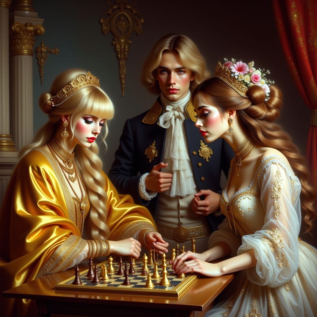 This image depicts a historical scene with Tsarina Eudoxia and Catherine I playing chess, as Tsar Peter the Great watches. Rendered in an oil painting style with dramatic lighting and opulent detail.