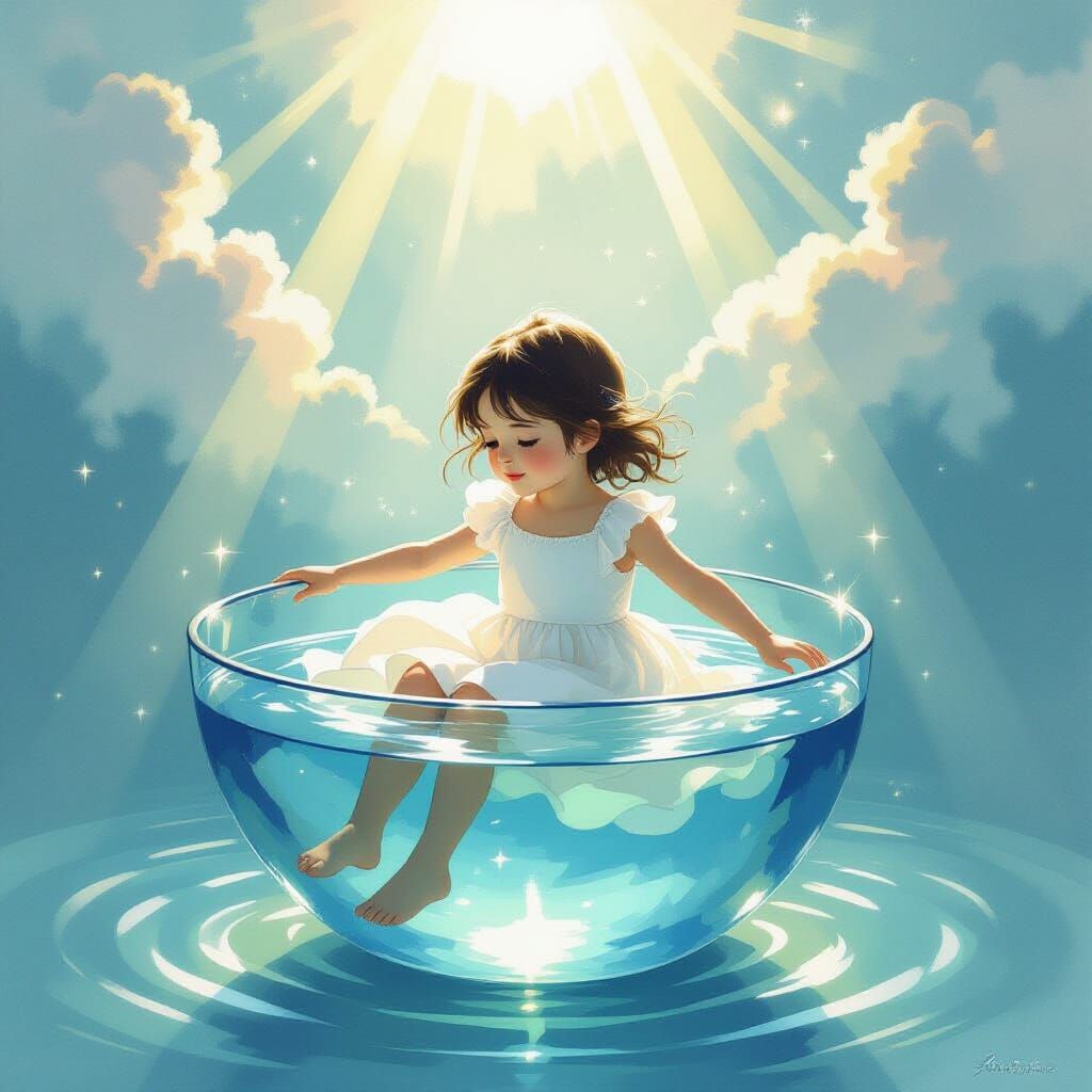 This image shows a girl in a white dress swimming in a fishbowl. The artwork evokes a dreamy surrealism with soft focus, light beams, and wispy brushstrokes in a watercolor style.