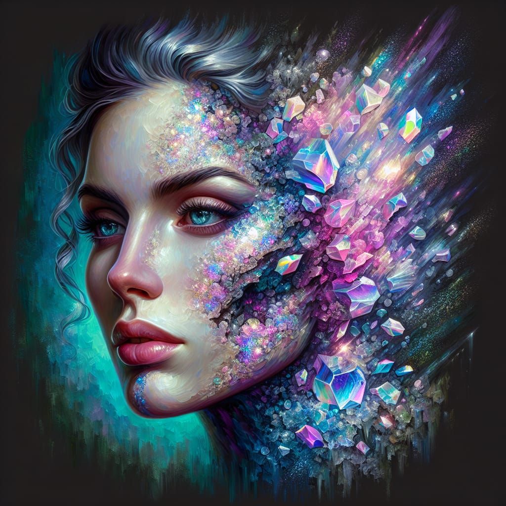 This portrait depicts a woman with one half of her face normal and the other crumbling into rainbow crystals, rendered with heavy, textured brushstrokes in an oil painting style.
