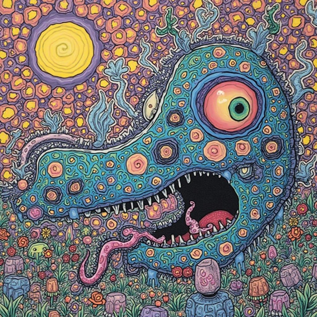 This image shows a bizarre, low-budget horror creature in a colorful, whimsical setting, blending elements of surrealism and sci-fi in a distinctive marshmallowpunk aesthetic.