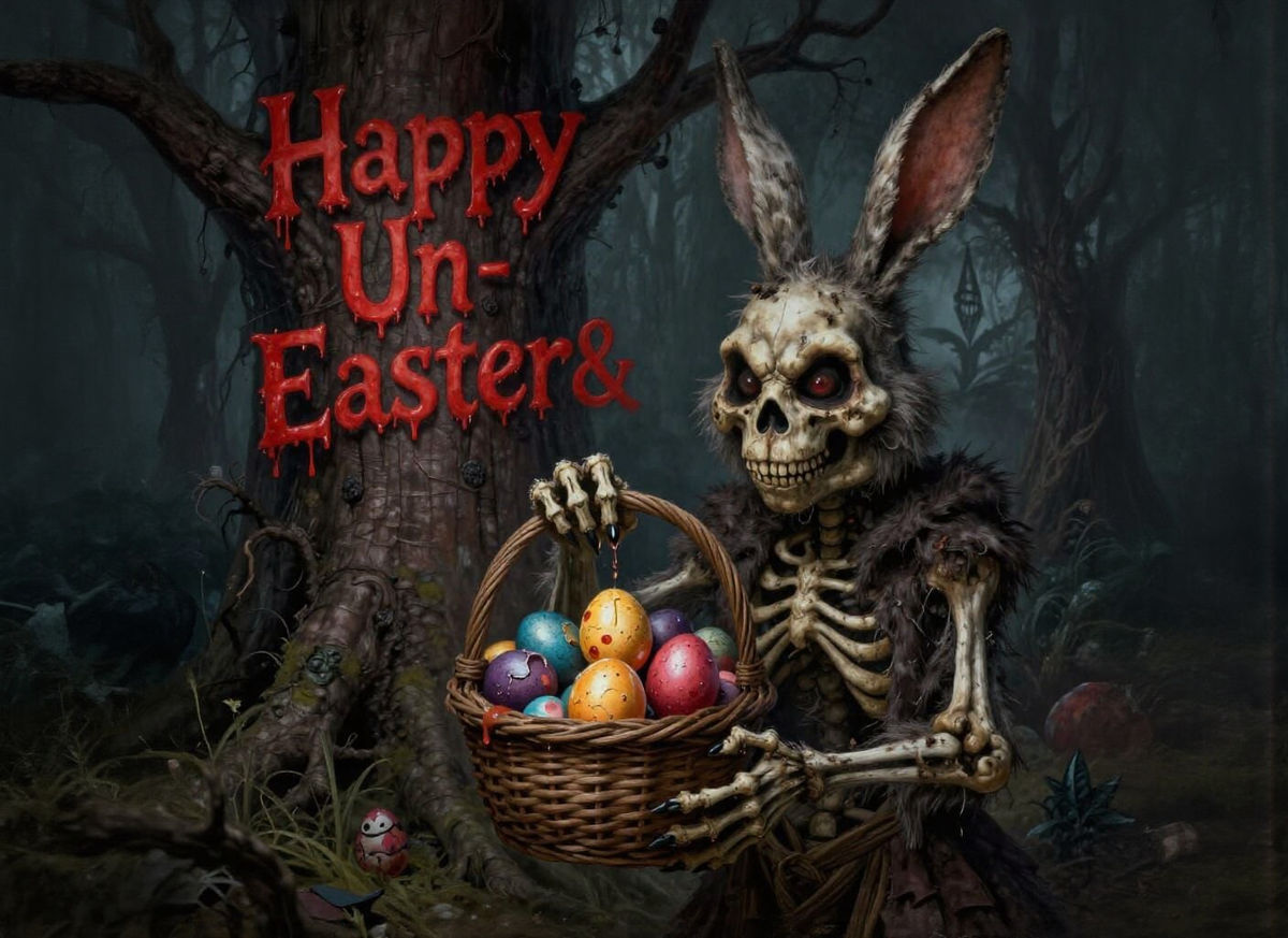 A detailed matte painting of a frightening Easter bunny distributing eggs, featuring a stark red caption. Rendered with deep colors and intricate detail, this fantasy concept art showcases a unique horror aesthetic.