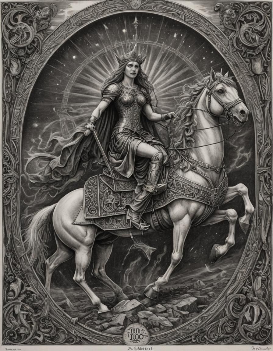 This image shows a hyperdetailed charcoal drawing of The Chariot tarot card. The artwork captures the symbolic elements of the card in a monochrome palette.