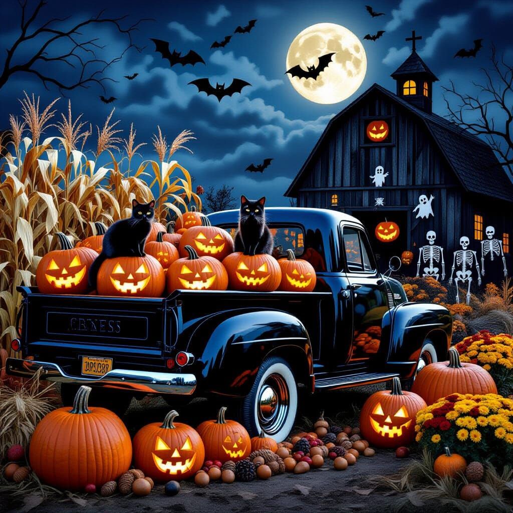 This image features a vintage black pickup truck loaded with Halloween decorations like pumpkins, cornstalks, and a scarecrow. A black cat sits on top, with a haunted barn in the background. Professional photography style.