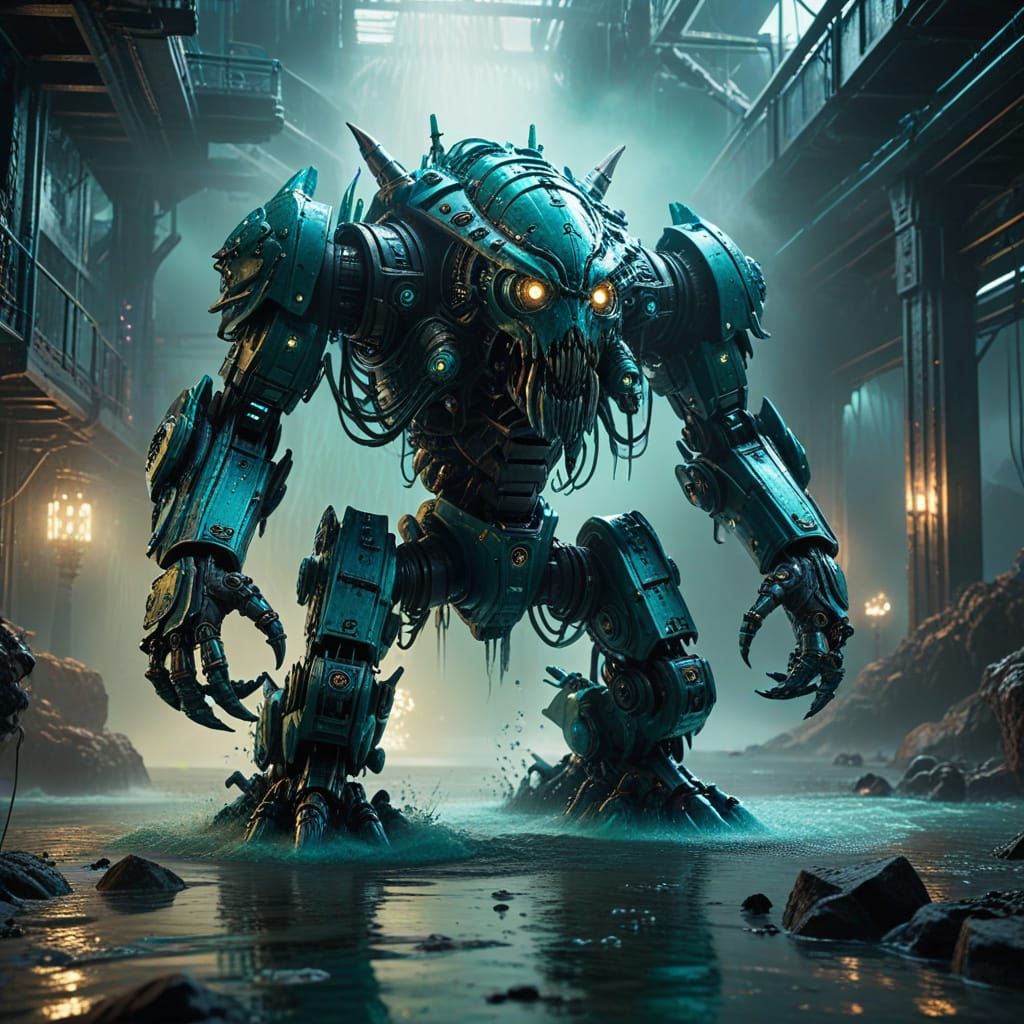 This image shows a ground-level shot of a monster standing in front of magical water. The artwork features detailed mechanical parts, polished metal, and a color palette of aqua, teal, and rose, rendered in 3D.