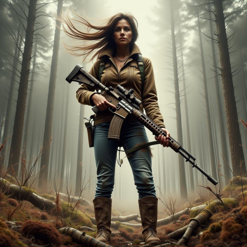 This image shows a strong woman standing confidently in a misty forest, wearing a worn leather jacket and camouflage boots, holding a weathered rifle, in a gritty, realistic illustration style