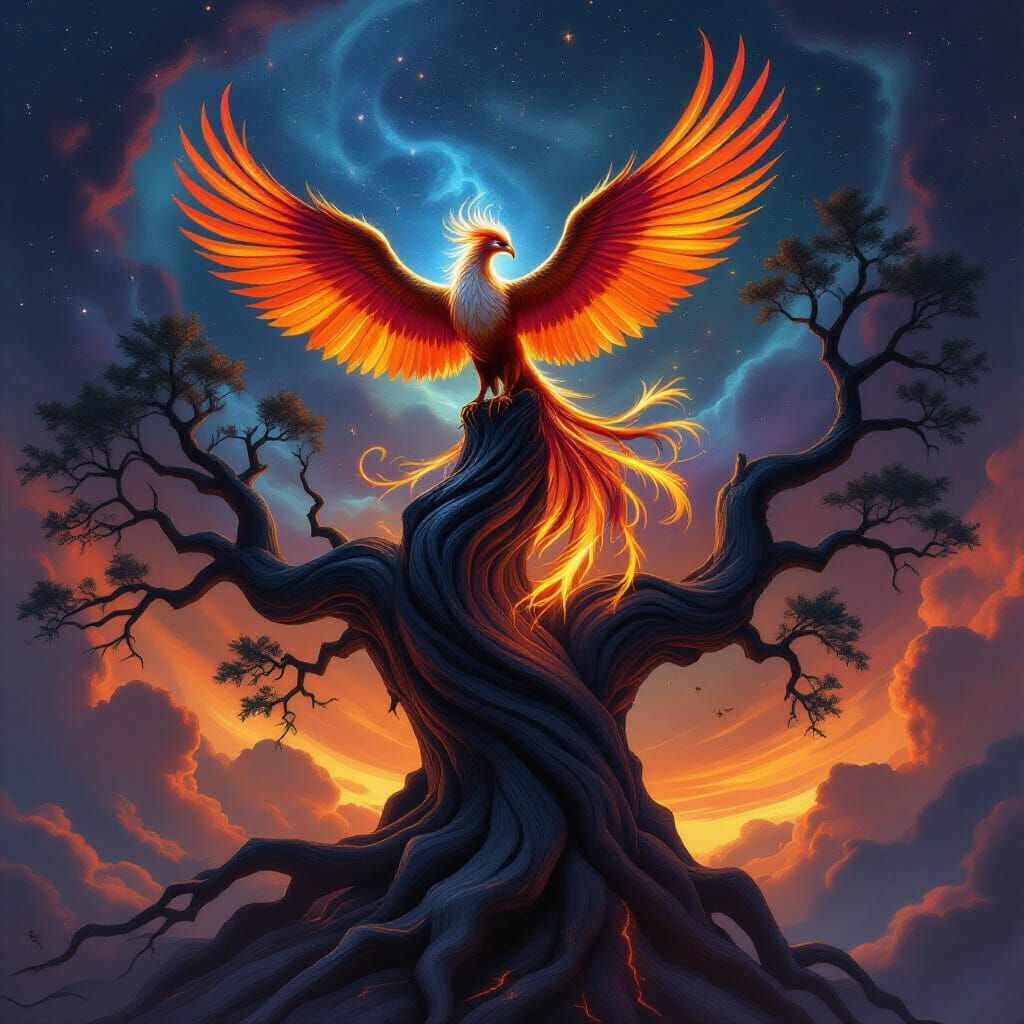 This image depicts a majestic phoenix with molten silver, burgundy, and ember feathers on an ancient obsidian tree. Set against a swirling cosmic nebula, it's epic fantasy concept art with vivid colors and dramatic lighting.