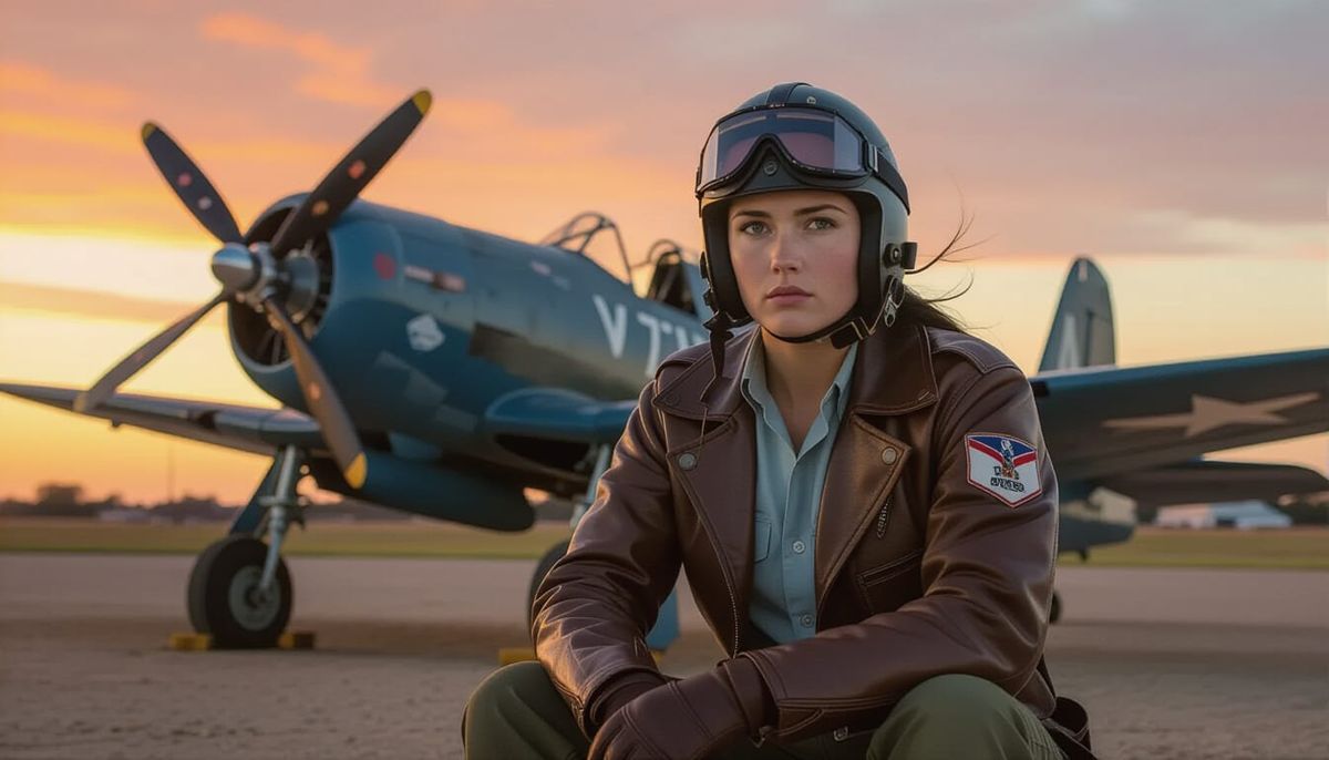 This image shows a young woman fighter pilot sitting in front of her Corsair plane. The portrait captures the spirit of adventure with bold brushstrokes and vivid colors in an expressionist style.