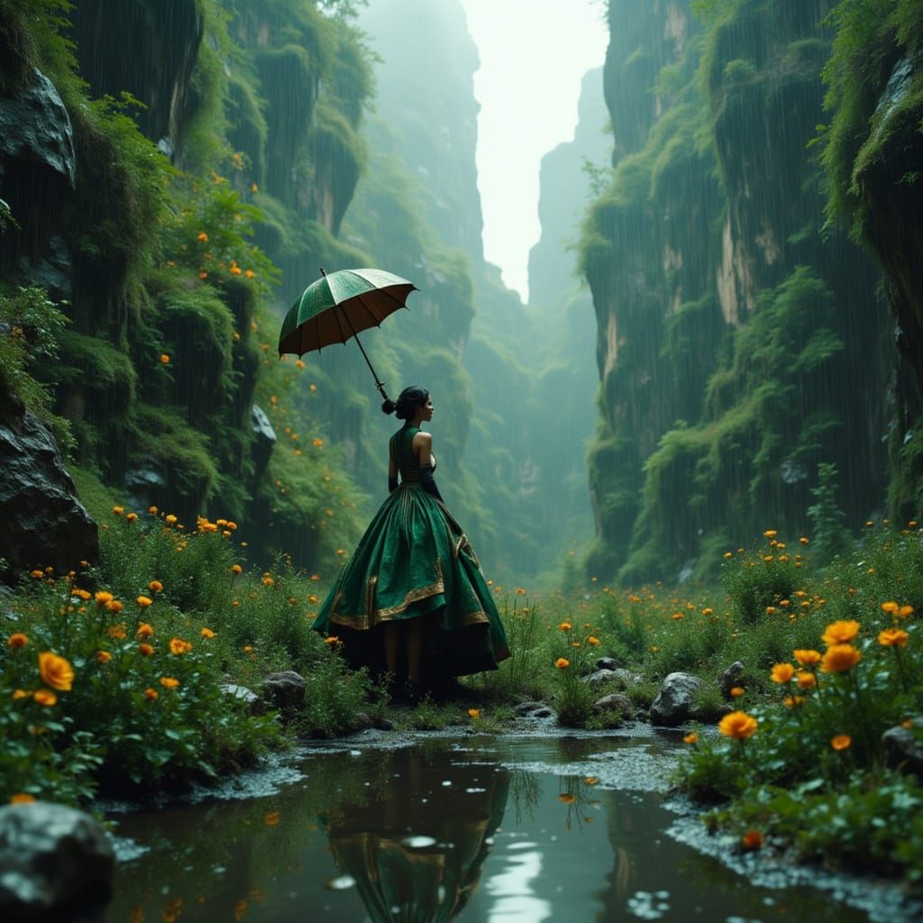This image shows a surreal, overgrown landscape bathed in rain. The scene blends natural elements with an otherworldly, dreamlike quality, enhanced by a sparkling collage effect.