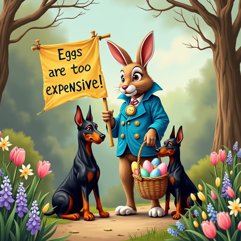 This vibrant Easter scene features the Easter Bunny surrounded by loyal Doberman Pinschers, a colorful banner, and a wicker basket overflowing with intricately decorated Easter Eggs, set amidst a blooming flower garden reminiscent of Beatrix Potter's stylized illustrations and Arthur Rackham's dreamlike ...
