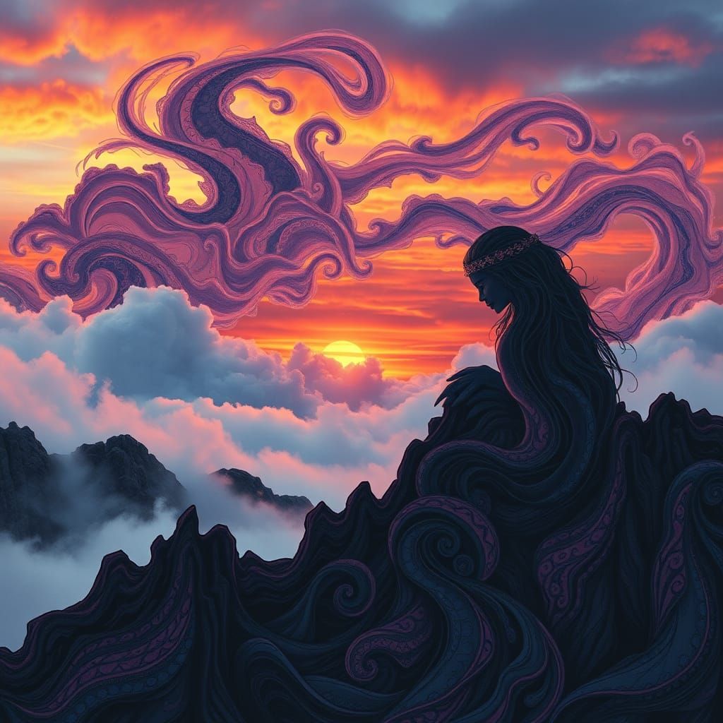 This image shows an abstract, dreamlike portrait of a Native American woman. The figure blends with a surreal landscape featuring rocky hills and swirling, colorful clouds in an alcohol ink aesthetic.