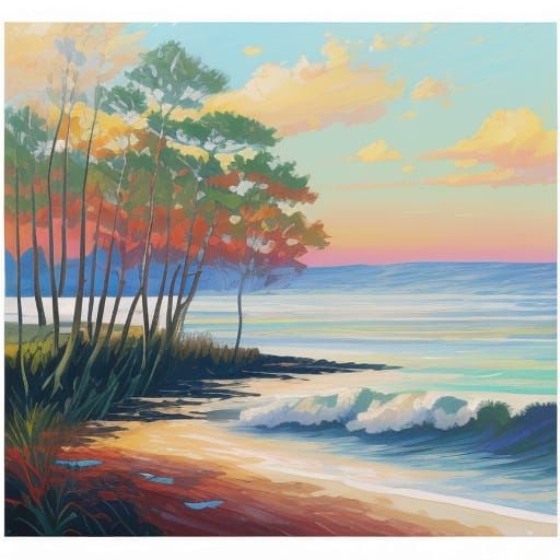 A vibrant gouache painting of a bamboo grove near the sea. The image features thick, expressive brushstrokes and heavy impasto textures, illuminated by soft, warm lighting. The artwork is highly detailed with vivid colors.
