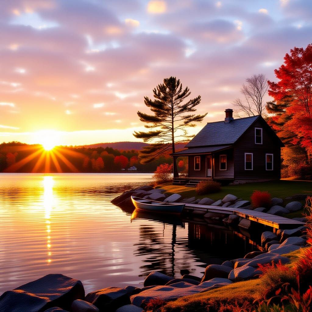 A serene image of a lakeside cottage at sunrise. The scene captures the essence of an autumn morning in Vermont with warm, inviting light.