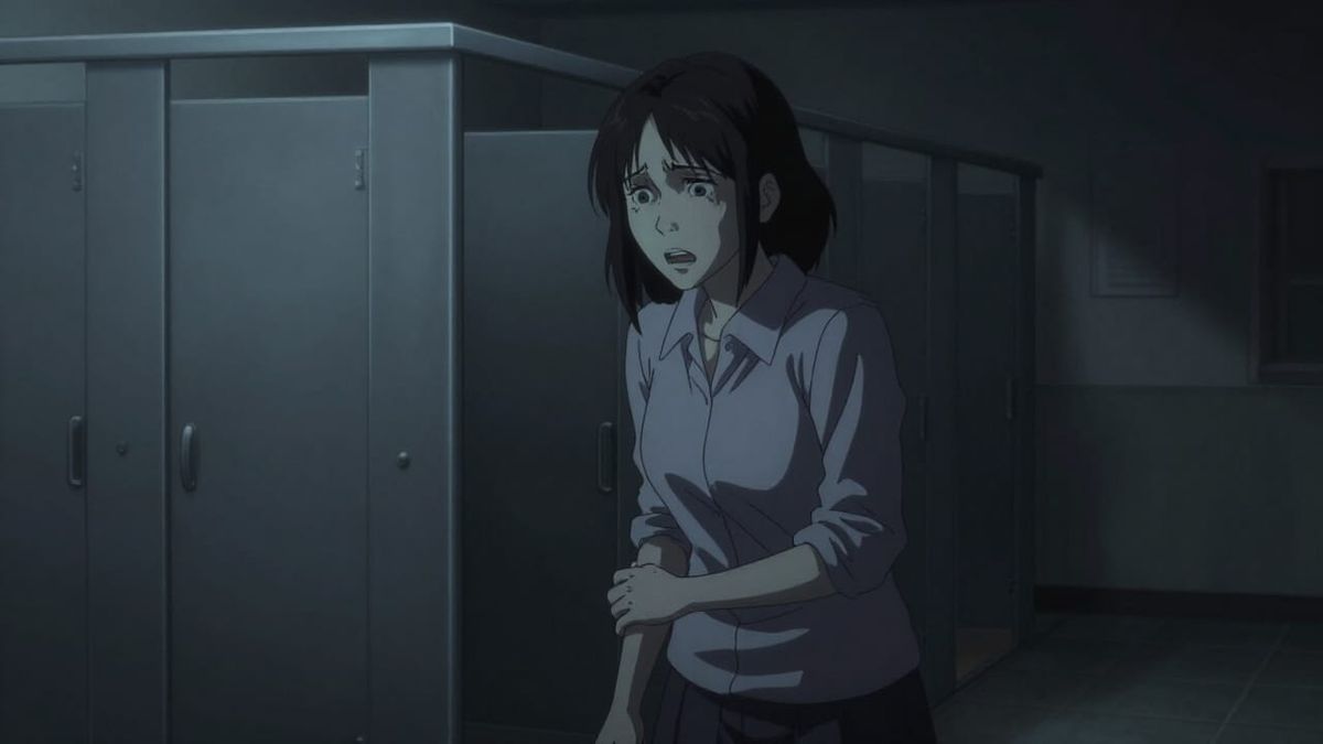This image shows a terrified female teacher in a school washroom at night. Dramatic lighting and psychological tension create a chilling, suspenseful atmosphere in a detailed animated style.