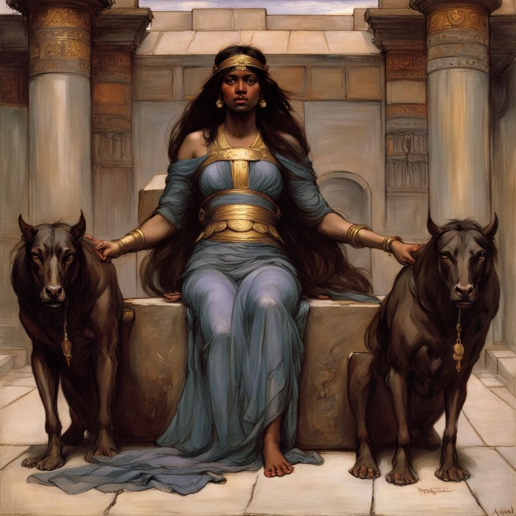 This image shows the Egyptian goddess Hathor, depicted with dark skin in the style of a Pre-Raphaelite painting. The artwork evokes classical beauty and mythology.