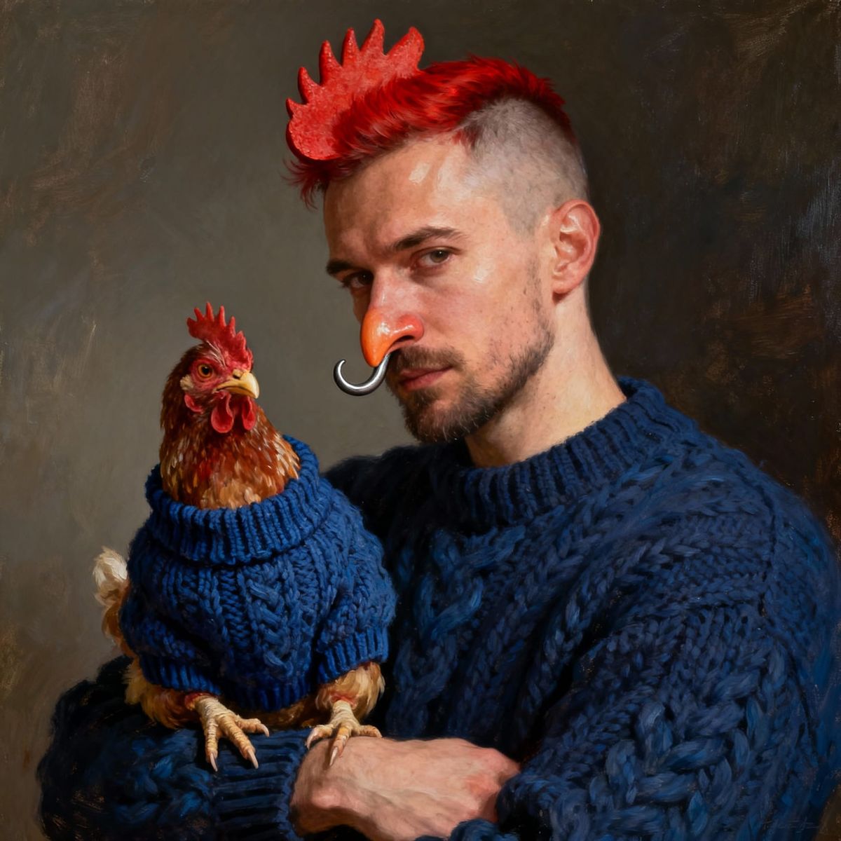 This highly detailed oil painting depicts a man holding his pet chicken, both wearing matching blue knitted sweaters. The man features a unique red hairstyle and a beak-like nose, rendered with subtle brushstrokes and soft lighting.
