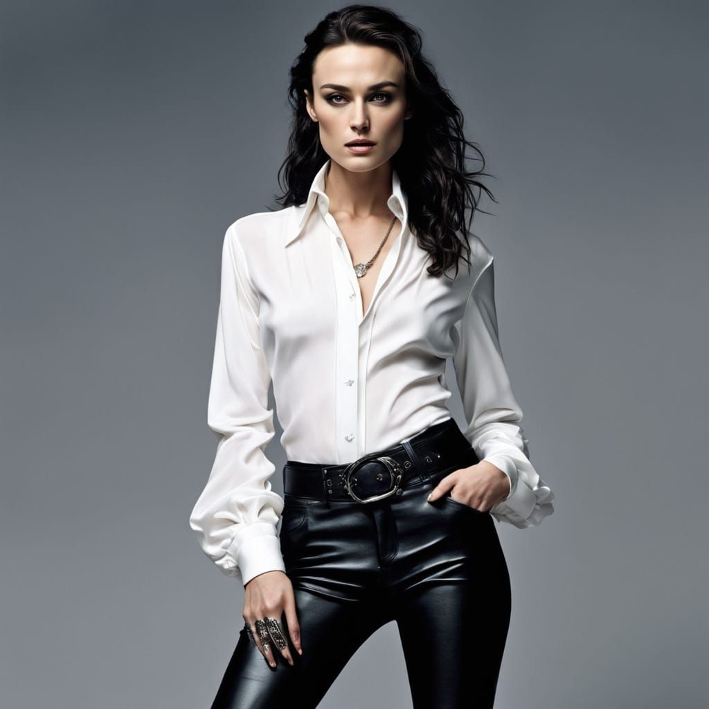 A striking picture of a rockstar with an ultrarealistic face and long black hair in a baroque updo. She wears a white satin blouse, leather jeans and long black gloves, in a sensual scene.