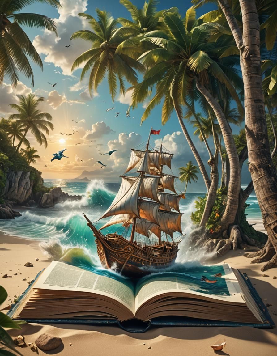 A surreal image of an open book, revealing a lush tropical beach with a sailing boat flying from its pages. This high-fantasy scene is rendered with intricate detail and vibrant colors.
