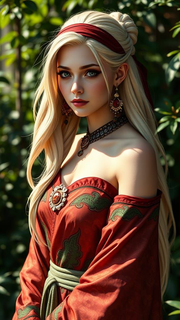 A photorealistic portrait of Tsunade, the Fifth Hokage from Naruto, standing in a sunlit natural setting. She wears her headband, jewelry, and colorful garments, leaning forward in a hyperrealistic style.