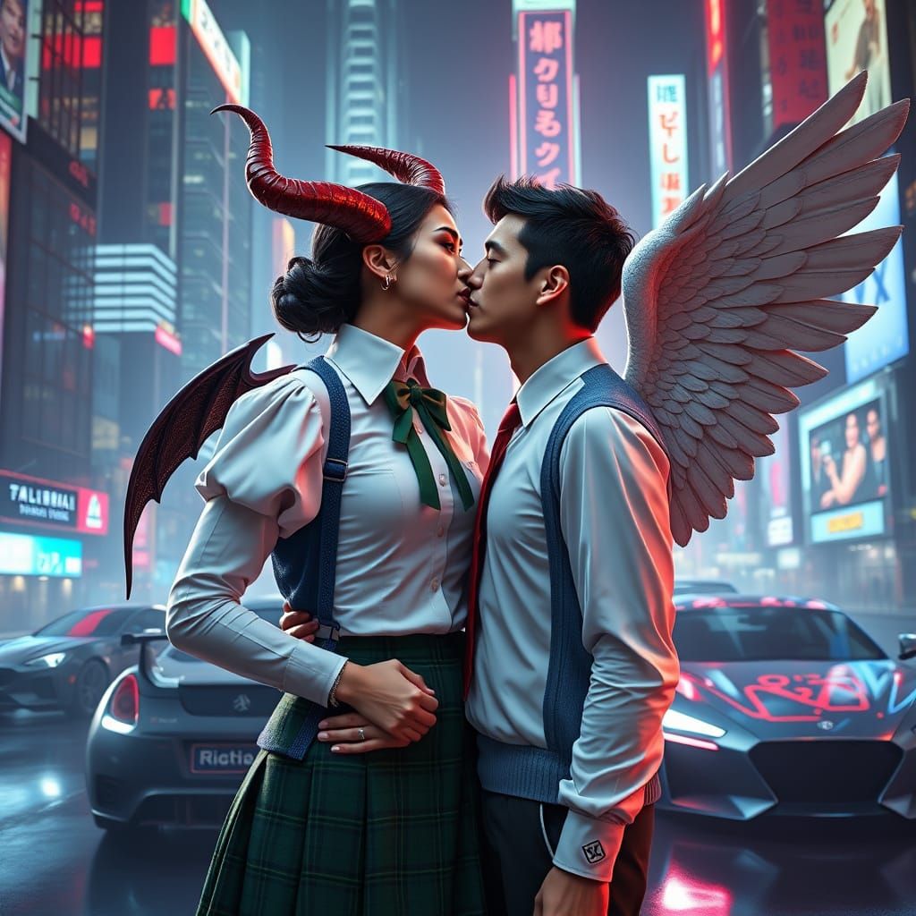 This image depicts a tender moment between a demon woman in a school uniform and an angel man, set against a backdrop of sleek, neon-lit skyscrapers and futuristic vehicles, with intricate details and metallic accents, in a dramatic and cinematic scene, reminiscent of Syd Mead's futuristic designs.