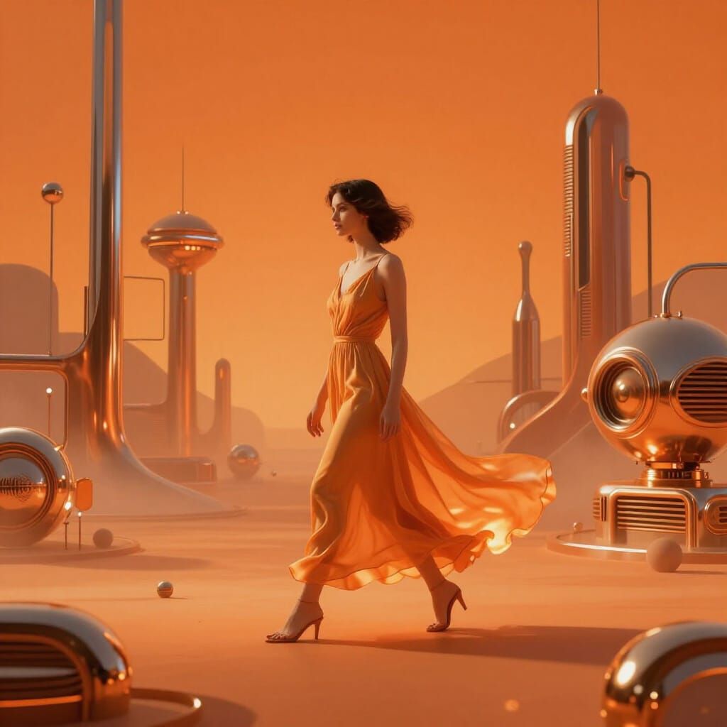 This image shows a woman in a flowing dress in an ethereal, retro-futuristic world. The scene features a prominent orange glow, chrome details, and vintage-inspired technology, rendered with surreal and optical illusion elements.