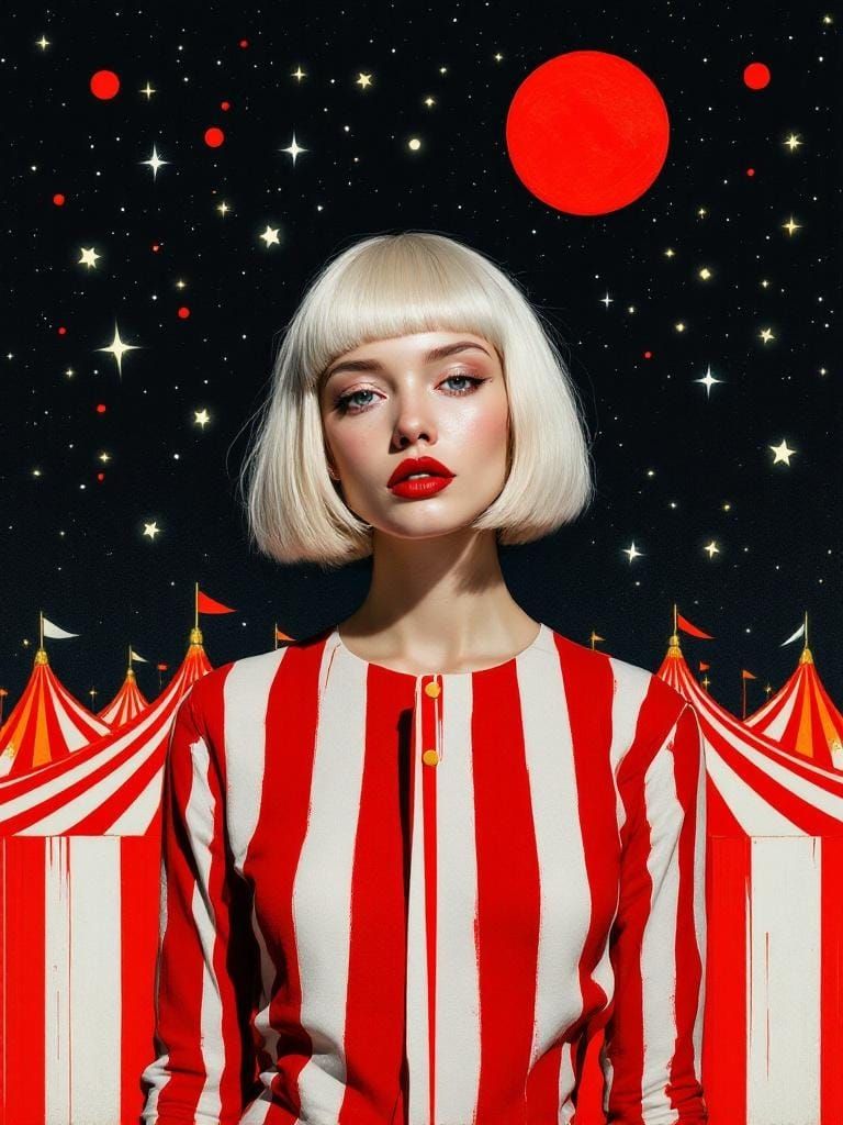 This image shows a fair-skinned woman with a blonde bob and red lipstick. She is set against a surreal red and white striped background with a dark, star-filled night sky, rendered with glitch art effects.
