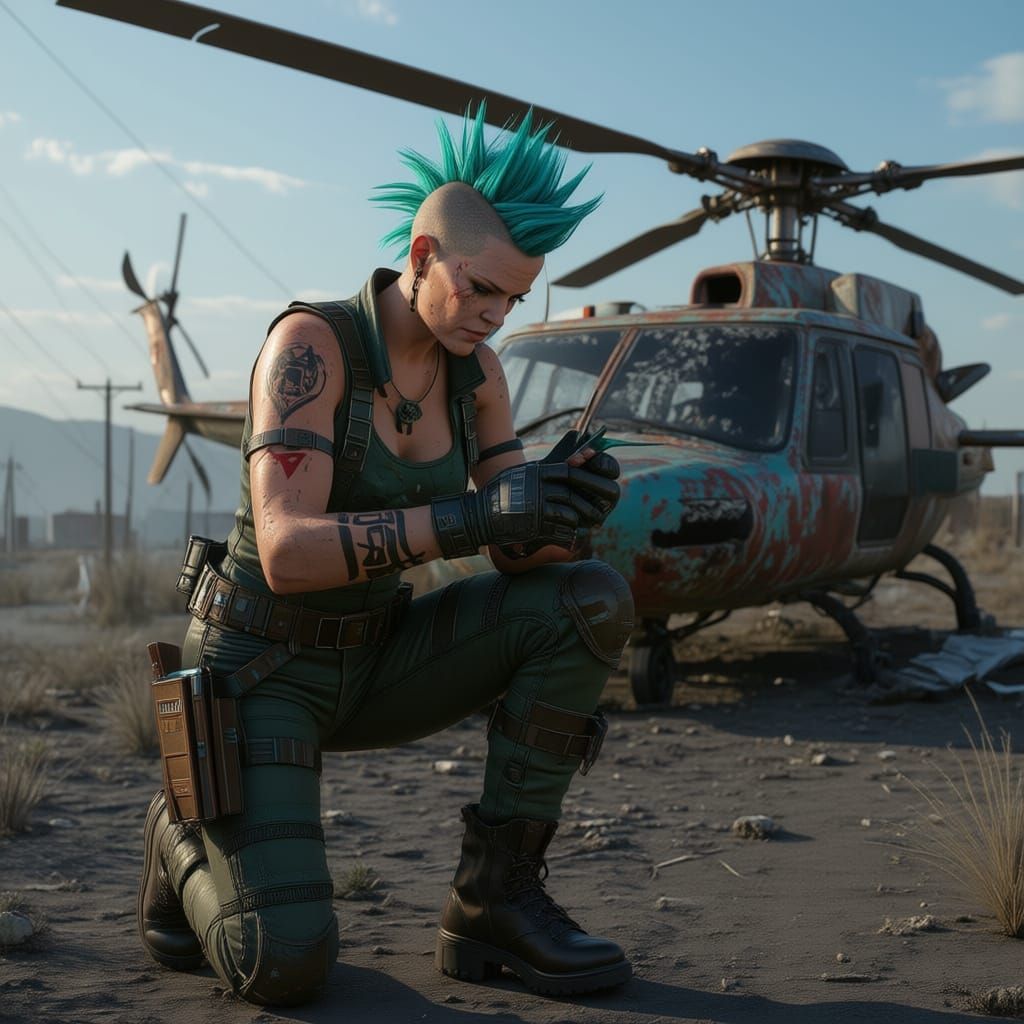 A strong woman with a blue and green mohawk fixes a rugged truck in a desolate wasteland. The image features dramatic lighting and a muted color palette with neon accents, rendered in a detailed concept art style.