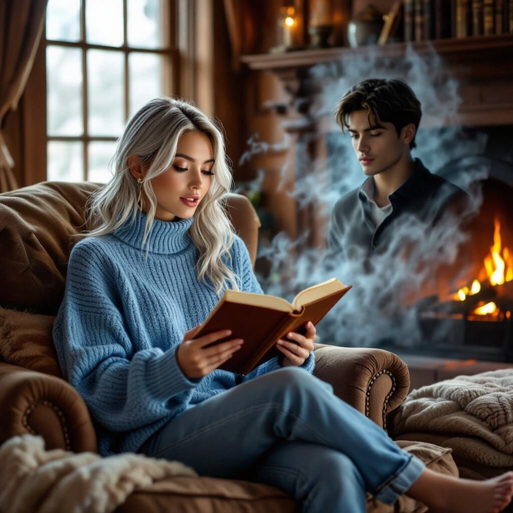 This image shows a woman reading in a luxurious study when her imaginary lover emerges from the book. The scene is hyperrealistic, with dramatic lighting that emphasizes romantic tension in an ethereal fantasy style.