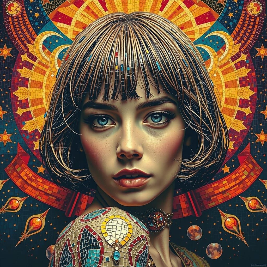 A mosaic artwork of a woman with iridescent colors. The colorful tiles create a stunning effect as she stands against a deep starry night sky. Rendered in maximalist style.