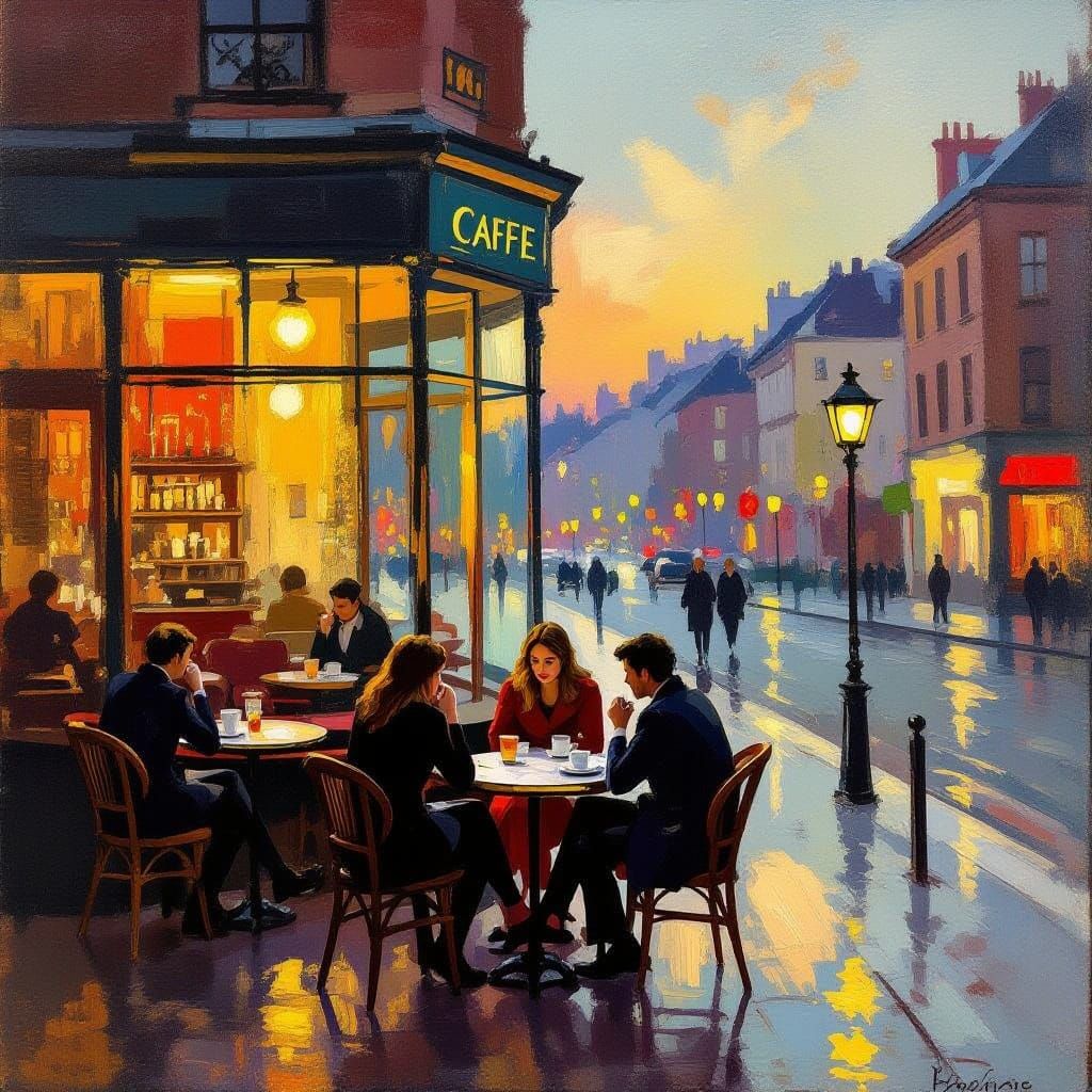 A cozy cafe scene at dusk, with soft golden light and intimate atmosphere, reminiscent of impressionist masterpieces with bold brushstrokes and vivid colors.