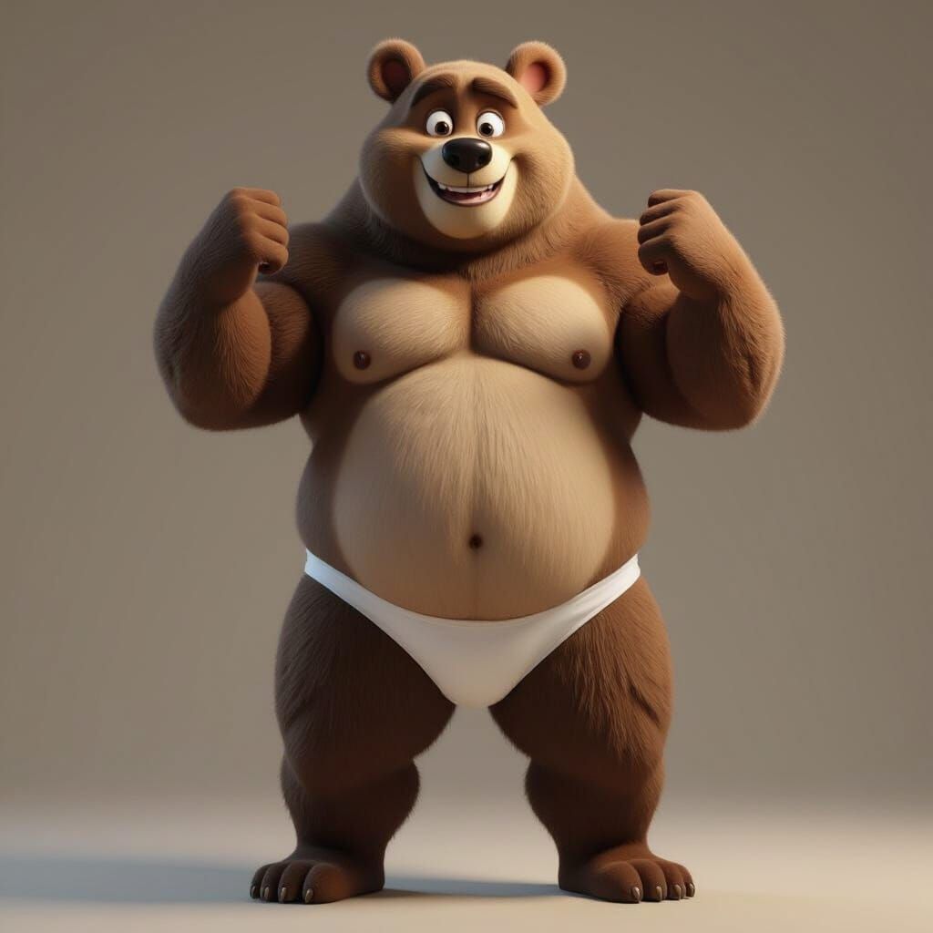 A 3D comic art image of a chubby, beefy male anthro bear. He is wearing a white thong and striking a confident pose against a simple gradient backdrop, rendered with smooth textures.