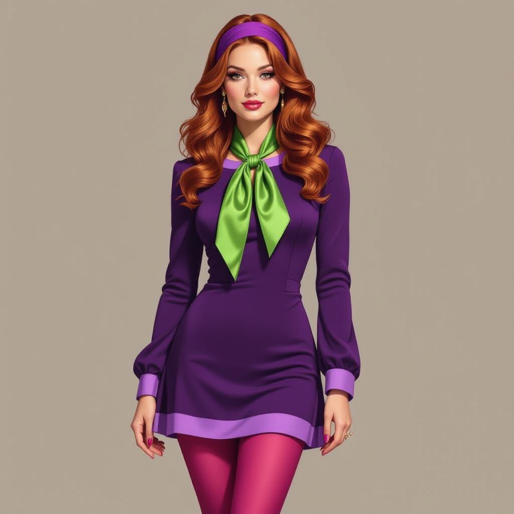 This image shows a woman in a vibrant purple mini dress with contrasting trim, styled with bold accessories and voluminous hair. Rendered in a detailed digital painting style with a rich color palette.