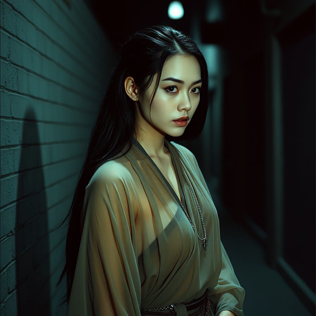 This image shows a female cyborg monk with long dark hair and a translucent robe, standing in a damp alley at night. The scene is rendered with cinematic lighting and a dramatic, film-like aesthetic.