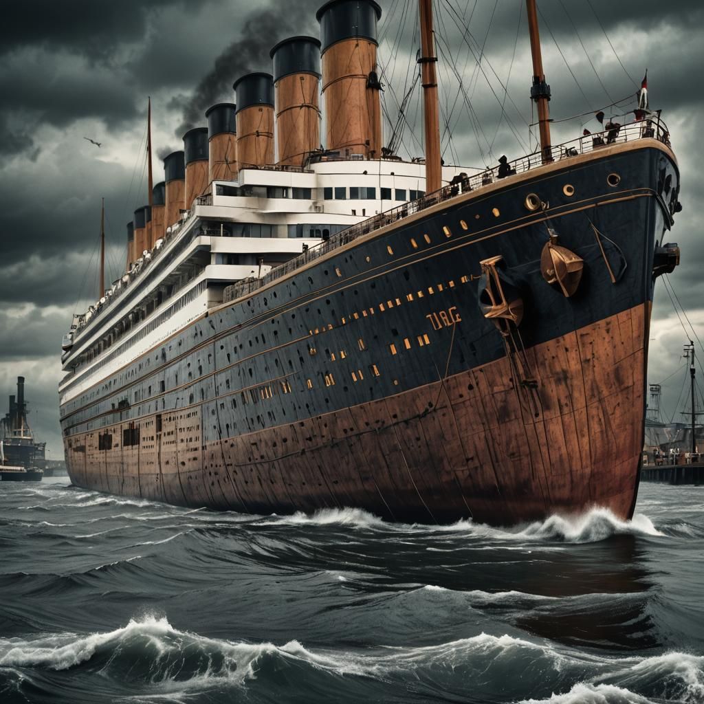 A hyperrealistic image of the Titanic. The high-resolution photograph features intricate details, perfect composition, and high contrast, conveying an atmospheric and moody scene.