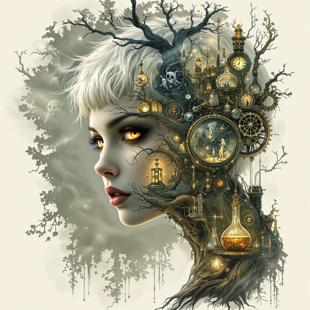 A double exposure presents a gothic fairy with spiky silver hair, amber eyes, and a steampunk laboratory backdrop. The fairy's face merges with tree roots and ghostly apparitions, in an art nouveau style.