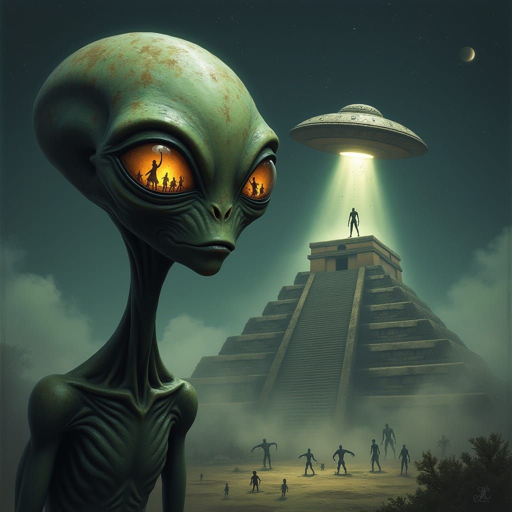 This haunting image depicts a slender, large-headed alien with bulbous eyes, one reflecting human silhouettes and the other glowing with an eerie light, as a miniature flying saucer abducts tiny humans amidst a mystical, star-filled backdrop.