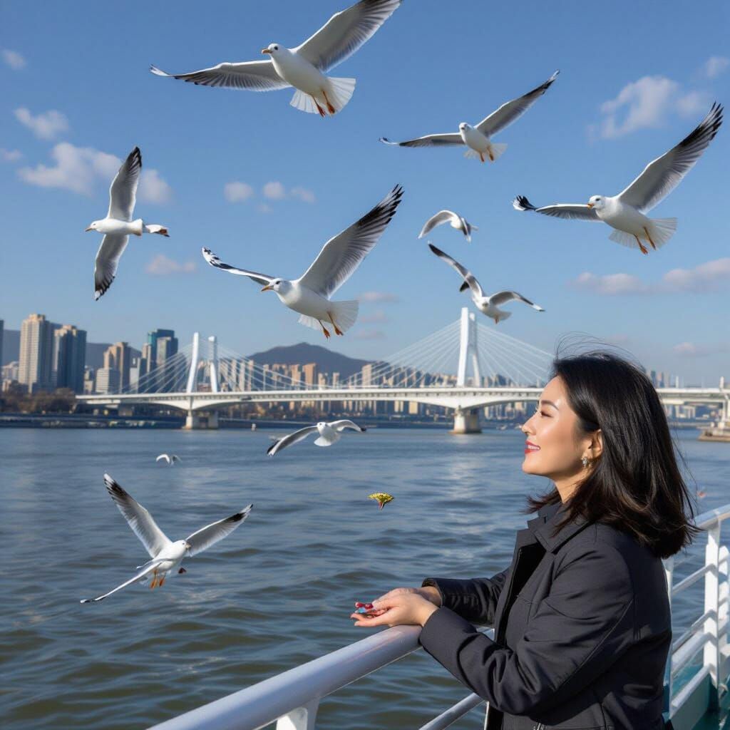 A realistic illustration of a 40-year-old Asian woman on a river cruise, feeding seagulls with bait. Features a sunny day, city skyline, and bridge, rendered with natural light and dynamic composition.