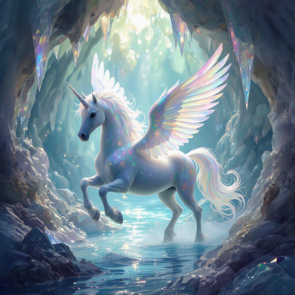 A surreal artwork of a Pegasus formed from pastel sea glass, set in a glowing crystal cavern. The image features iridescent wings and prismatic light effects, creating an otherworldly atmosphere.