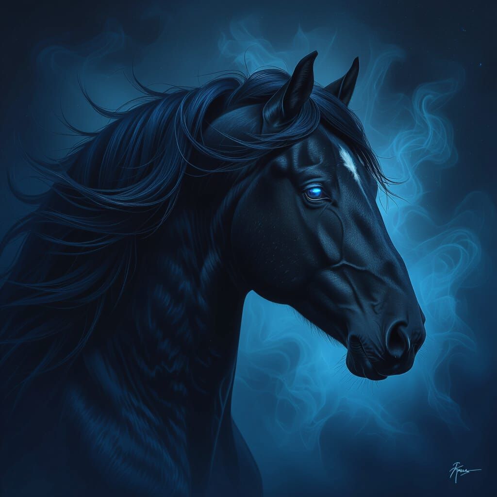 A hyperrealistic digital painting of a black horse head in profile, featuring flowing mane and dramatic rim lighting. Subtle bioluminescent blue embers add a mystical glow against a smoky indigo background.