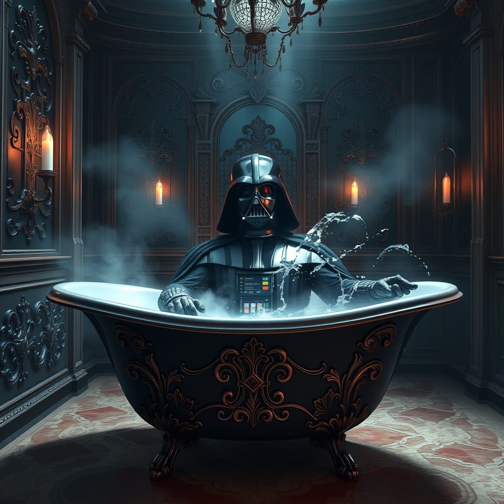 This image shows Darth Vader in a steaming, ornate bathtub within a dark, gothic chamber. The scene features dramatic lighting and rich colors, rendered as a highly detailed matte painting in a fantasy concept art style.