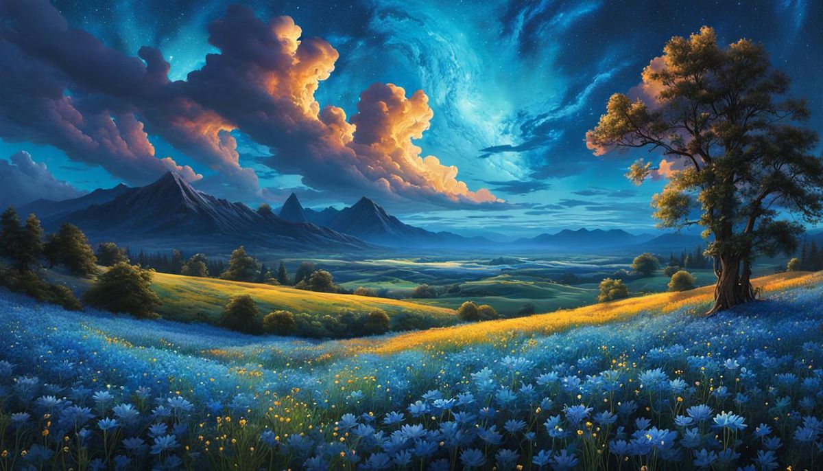 milky way galaxy over bio-luminescent Blue wildflower field in full bloom, breathtaking artwork by Ansel Adams, colorful sky, J. R. R. Tolkien, Ismail Inceoglu, Junji Ito, maximalist, Epic scale, intricately hyperdetailed, clear environment, 16k resolution, cel-shaded, glossy, photorealism, LSD art, ...