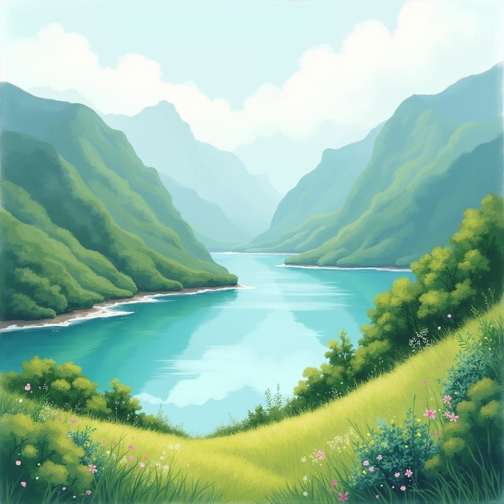This image shows a peaceful, idyllic scene with soft pastel colors, gentle brushstrokes, and serene turquoise waters, evoking the dreamy quality of French impressionism and Japanese watercolor techniques.